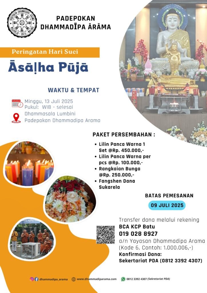 Maka pada kesempatan ini, Ibu Bapak Saudara seDhamma dapat ikut hadir dalam acara Peringatan Āsāḷha Pūjā di Padepokan Dhammadīpa Ārāma yang dilaksanakan pada Minggu, 13 Juli 2025 pukul 13.00 WIB – selesai, bertempat di Dhammasala Lumbini