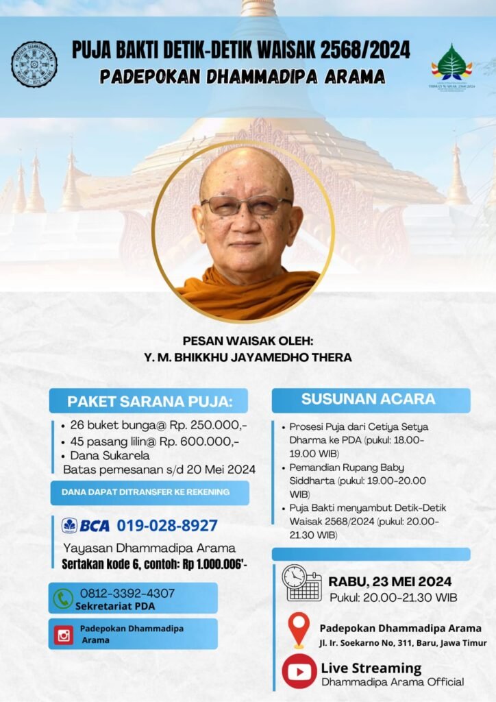 Ibu Bapak Saudara seDhamma dapat mengikuti Pujabakti secara offline. Kegiatan ini dilaksanakan pada Kamis, 23 Mei 2024 pukul 20.00 – selesai.